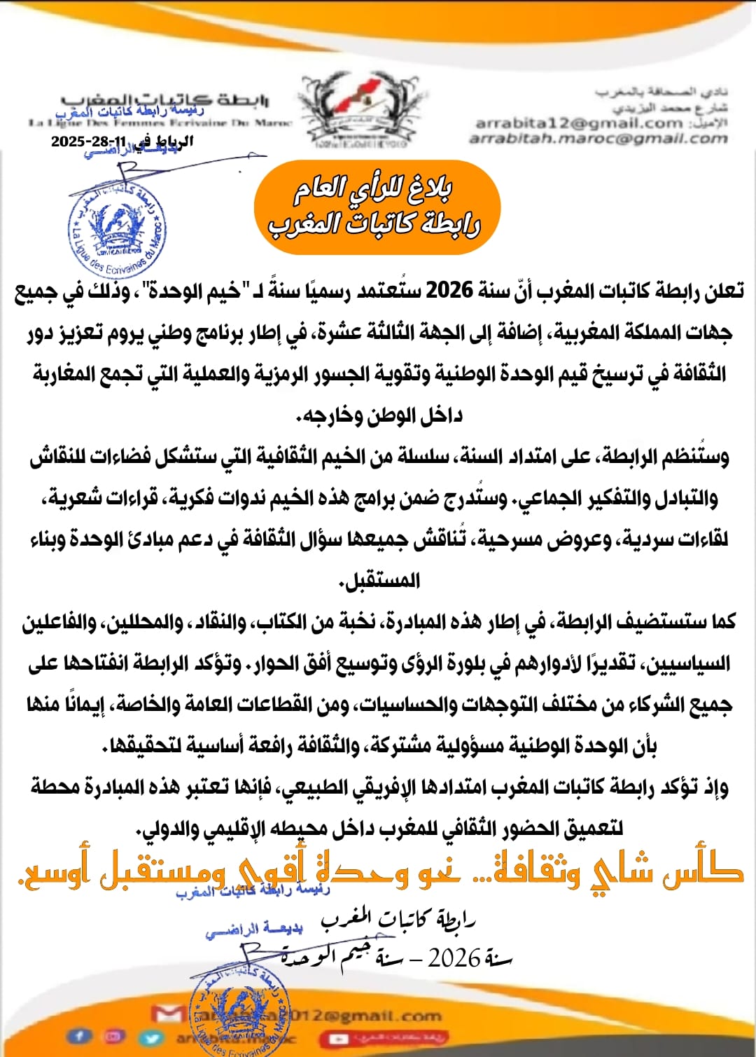 أصدرت رابطة كاتبات المغرب بلاغًا تُطلع فيه الرأي العام على إطلاق مشروع ثقافي وطني جديد يحمل اسم “خيم الوحدة 2026″، والذي سيشمل جميع جهات وأقاليم المملكة، إضافة إلى الجهة الثالثة عشرة. وتأتي هذه الخطوة ضمن برنامج يرمي إلى تعزيز حضور الثقافة كقيمة جامعة، وتقوية الروابط التي تجمع المغاربة داخل الوطن وخارجه.